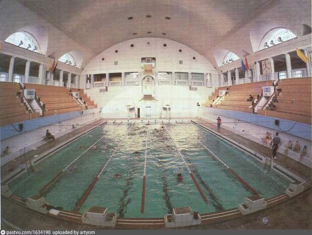 Внутри помещения оборудовали по последнему слову техники на тот момент. Здесь располагался 25-метровый бассейн с шестью дорожками. Его максимальная глубина достигала 5 метров. Также тут находились вышки и трамплины, чтобы могли тренироваться прыгуны в воду. Интересно, что по периметру бассейна разместили кафельные сидения с подогревом. Для спортсменов, которым становилось прохладно после пребывания в воде.