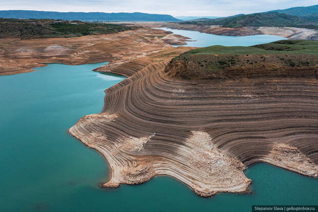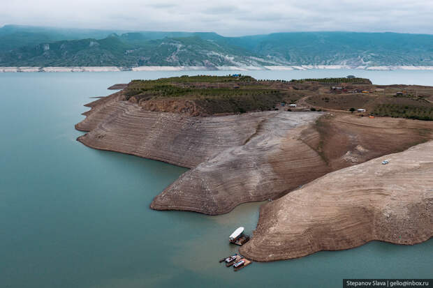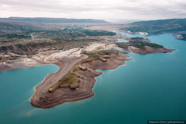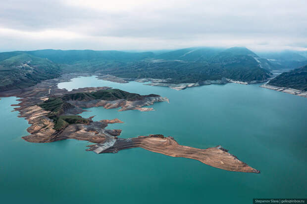 12. Строительство Чиркейской ГЭС началось в 1970 году, а заполнение водохранилища закончилось в 1974 году. До этого здесь были обрывистые горы.