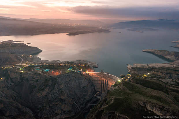 8. После строительства Чиркейской ГЭС среди скал каньона раскинулось большое водохранилище, которое находится на высоте 335 м над уровнем моря. Весь огромный объём воды удерживает стройная арочная плотина — она сужается от 338 метров наверху до 12 метров внизу. А высота этого изогнутого клина — 232 метра. Плотина Чиркейской ГЭС — самая высокая арочная плотина в России.