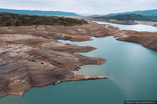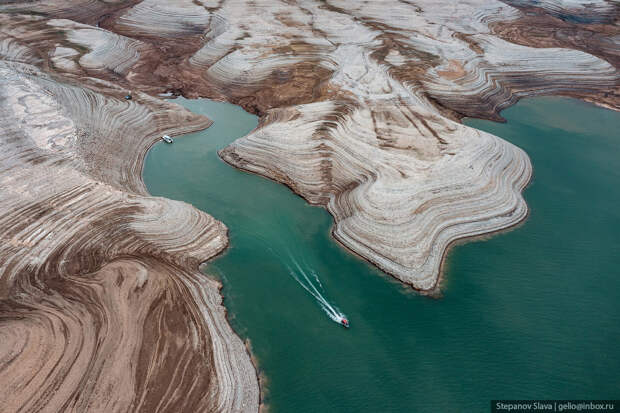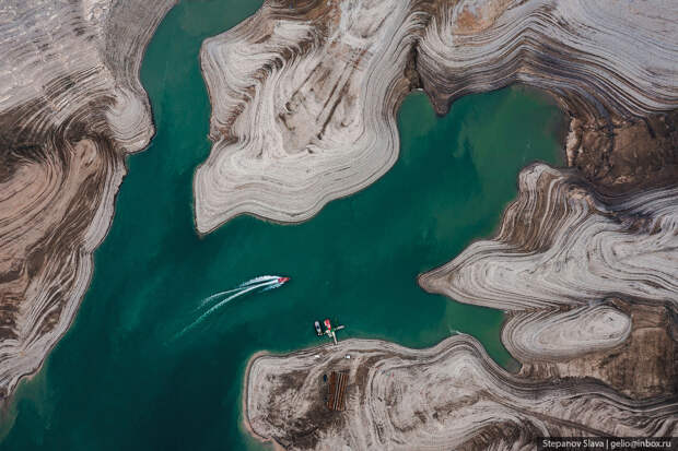 12. Берега водохранилища раньше были стенами ущелья. Сейчас вершины некоторых гор превратились в острова.