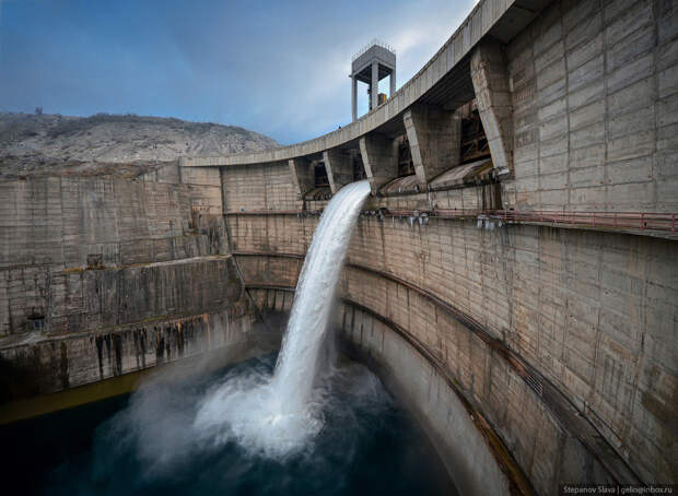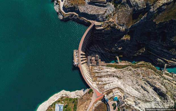 2. Высота Чиркейской ГЭС 232,5 м — это самая высокая арочная плотина в России. Ширина верхней части 338 м, а книзу конструкция клинообразно сужается до 12-15 м. Из-за маленькой ширины основания не получилось даже построить классический машинный зал — агрегаты установили рядами, а трансформаторы и распределительные устройства — над ними, на другом ярусе.