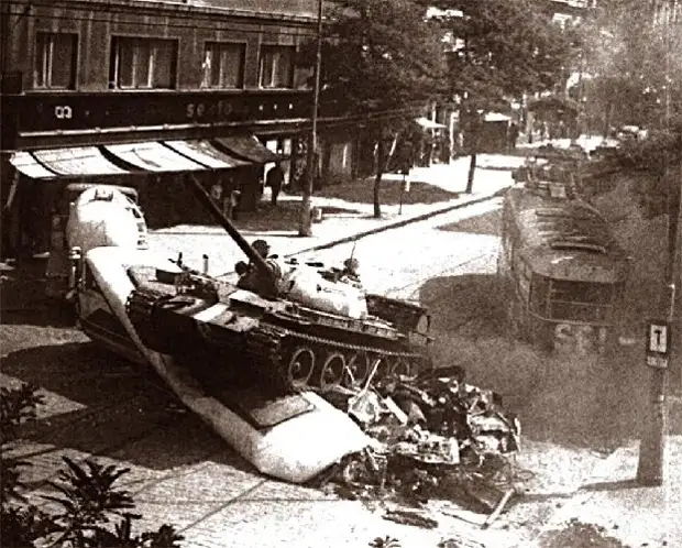 Бунтующие горожане возводили баррикады из трамваев. Советский танк прорывает кольцо баррикад.