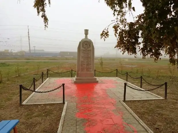 Памятник чехословацким легионерам в Михайловке, плитка облита красной краской в день приезда чешской делегации.