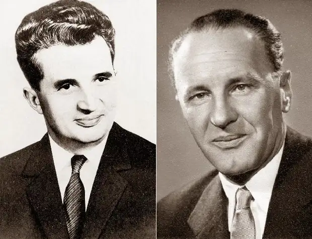 Слева: Николае Чаушеску – генеральный секретарь ЦК Румынской коммунистической партии с 1965 года. Справа: Янош Кадар – генеральный секретарь Венгерской социалистической рабочей партии; в 1956-1958 и 1961-1965. Период его правления, отмеченный либерализацией политической жизни и доступностью товаров народного потребления, ныне значительная часть венгерского общества испытывает ностальгию по «временам Кадара» с их высоким уровнем и качеством жизни.