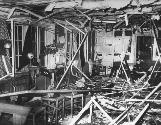 Но все прошло не так гладко: из-за спешки и травмированной руки он смог воспользоваться только одним из двух блоков взрывчатки, которого оказалось недостаточно для убийства. Кроме того, за мгновения до взрыва один из участников совещания переставил злополучный портфель подальше от Гитлера, и тяжелый дубовый стол защитил председателя НСДАП от ударной волны. Погибли четверо офицеров, но виновник происходящего остался целым и практически невредимым, отделавшись только легкой контузией.Комната для совещаний после взрыва