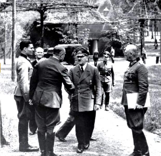Заговорщики долго готовились и копили силы, а главное – смелость. Их шанс настал 20 июля 1944 года. Штауффенберг, потерявший кисть правой руки, пальцы на левой и левый глаз в ходе боев в Африке, награжденный герой не вызывал подозрений. Более того, за месяц до покушения полковника назначили начальником штаба той самой Резервной армии, а в этом качестве он получал доступ «к телу» фюрера в его секретной ставке «Вольфшанце» (Волчье логово), расположенной неподалеку от Растенбурга в Восточной Пруссии.За пять дней до покушения на Гитлера полковник Штауффенберг (крайний слева) случайно встретился с фюрером возле ставки «Волчье логово»