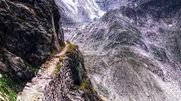 | Слева возвышалась скала, справа - обрыв. Тропа шириной чуть больше метра. Шли цепочкой: сопровождающий (он же начальник экспедиции), за ним я и дальше все сотрудники. Замыкали шествие ишаки, подгоняемые погонщиком. Время от времени до меня доносились своеобразные звуки погонщика - от цоканья до гортанных вскриков. Мы к ним уже привыкли. Шли очень медленно, осторожно, прижимаясь к скале и боясь смотреть в бездну. |
