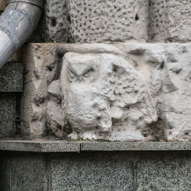 У оснований тонких колонн, оформляющих углы центрального ризалита фасада с М. Ржевского пер., притаились совы. Совы или филины — одни из самых популярных образов у художников и поэтов-символистов, символ мудрости и вечной жизни. На фасаде по Хлебному переулку над большим окном в мастерской расположены четыре майоликовых полукруга — музы четырёх искусств: ваяния, живописи, архитектуры и музыки. Над ними — Афина Паллада, которая в эпоху модерна сменила Аполлона в деле покровительства искусству. Выше Афины — майоликовое панно «Сумерки», выполненное в Абрамцевской мастерской по эскизам знаменитой художницы Марии Якунчиковой. Все окна имеют разную форму.