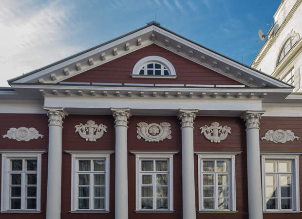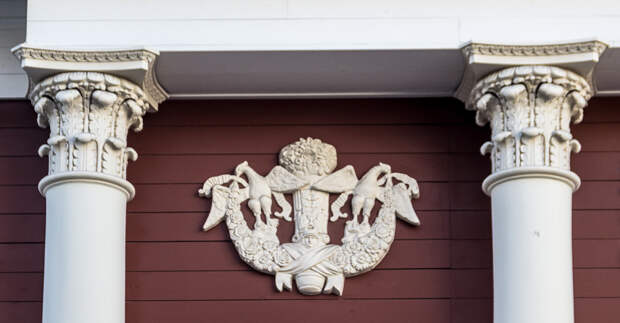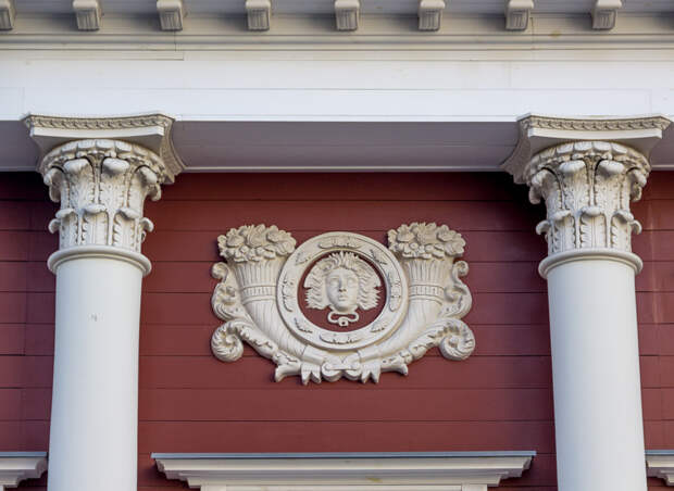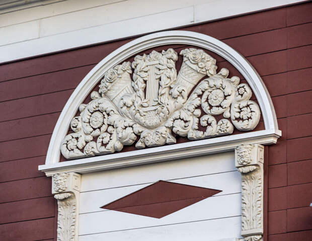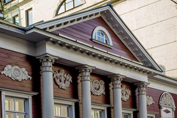Фасад дома украшен портиком, завершенным фронтоном с полуциркульным окном с четырьмя коринфскими колоннами, колонны и лепнина деревянные.