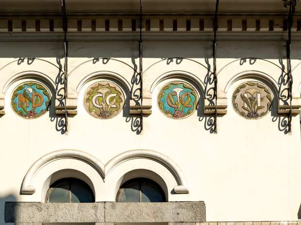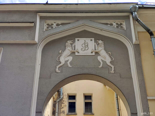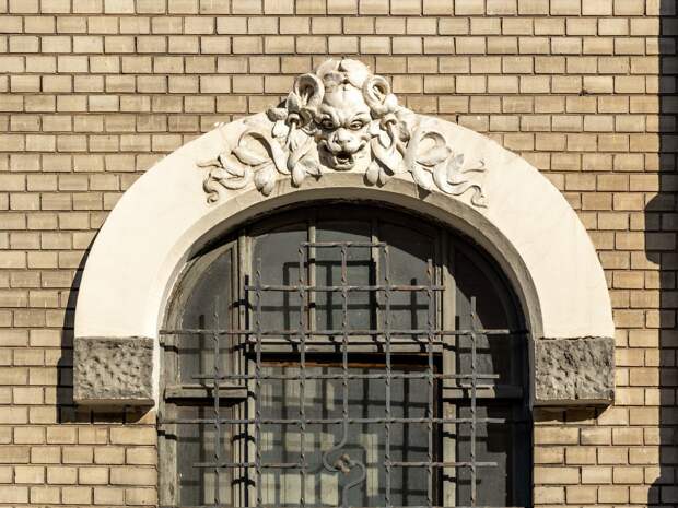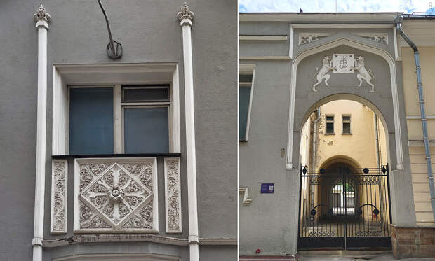 Монограмму владельца на фасаде поддерживают два рельефных льва.