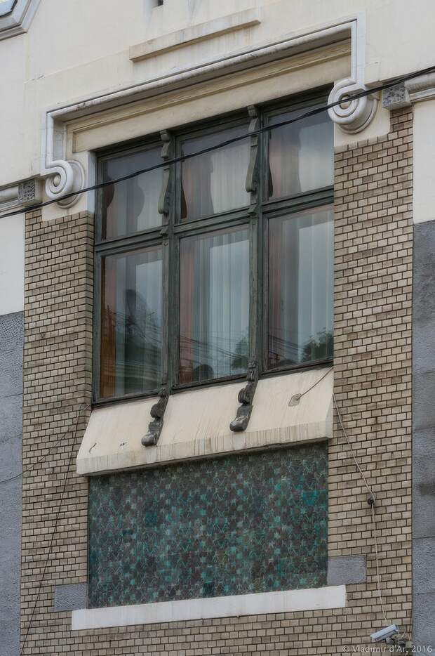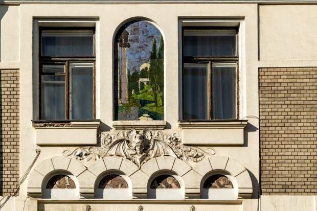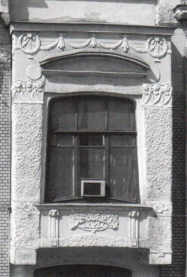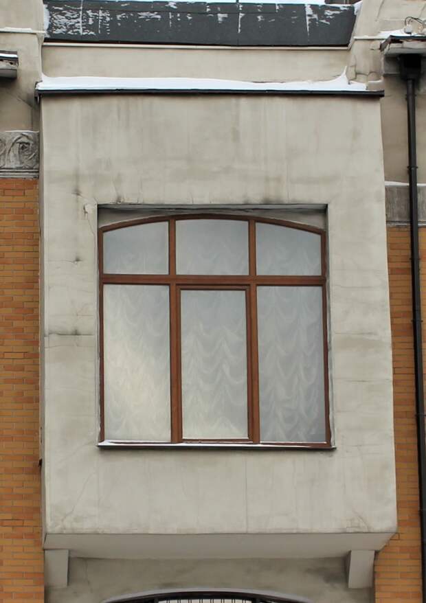 Громадное трёхчастное окно гостиной на втором этаже по М. Ржевскому переулку украшено по бокам волютами, а снизу — керамическим «ковром» из зеленых изразцов, сделанным, скорее всего, по эскизу М. Врубеля. На том же фасаде арочное окно лестницы охраняет, как в средневековом замке, химера.