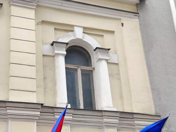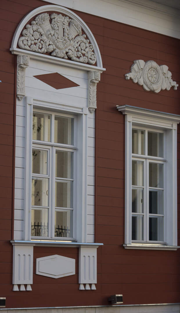 Вытянутые прямоугольные окна фасада обрамлены наличниками и лепными орнаментами в стиле ампир, появившимися после 1812 года.