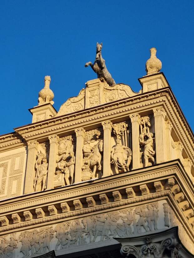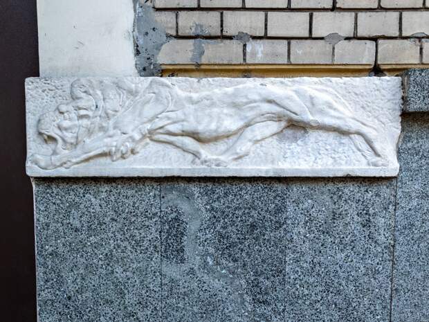 У входа оскалился лев работы знаменитого скульптора Николая Андреева — царь зверей, традиционный символ силы и мужского начала, непрерывной борьбы, солнечного света, царского сана и победы.
