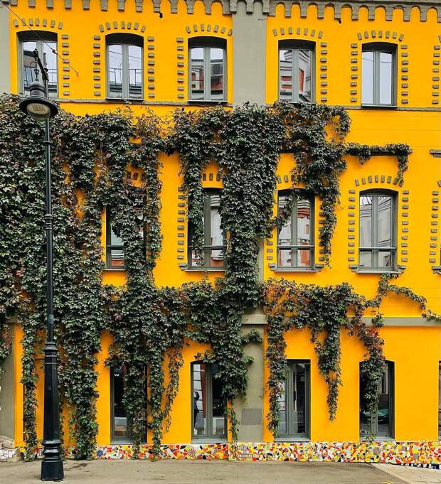 Фасад здания выделяется ярко-жёлтым цветом и нестандартным оформлением. Здание украшено зеленью и декорировано керамической плиткой. Атмосфера этого места словно переносит прохожих в солнечную Испанию.