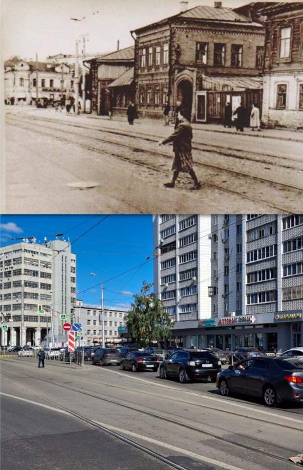 Квартал слева — от Чернышевского до улицы Сакко и Ванцетти (сейчас Рустема Яхина) — был снесён в наше время. Сохранился лишь маленький одноэтажный флигель. Он хорошо виден на чёрно-белом кадре — с высоким фигурным фронтоном. На современном снимке уже надстроен на один этаж.