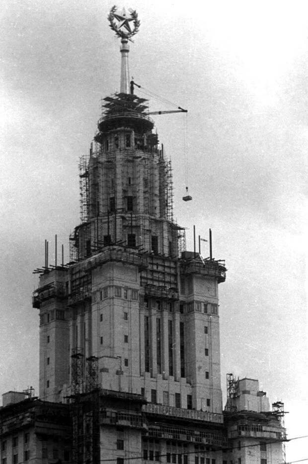 «…Поднимаясь по лестнице к звезде, я немного волновался. Это чувство испытываешь всегда, если знаешь, что за тобою следит множество глаз. Но когда я взобрался и уселся на одно из звеньев венка, чтобы удобнее было работать, сразу успокоился. Москва была скрыта от меня густым туманом, поднявшимся над Москвой-рекой…».Село Воробьево перед началом строительства МГУ, 1948 год.Вид на МГУ, 1961-1963гг