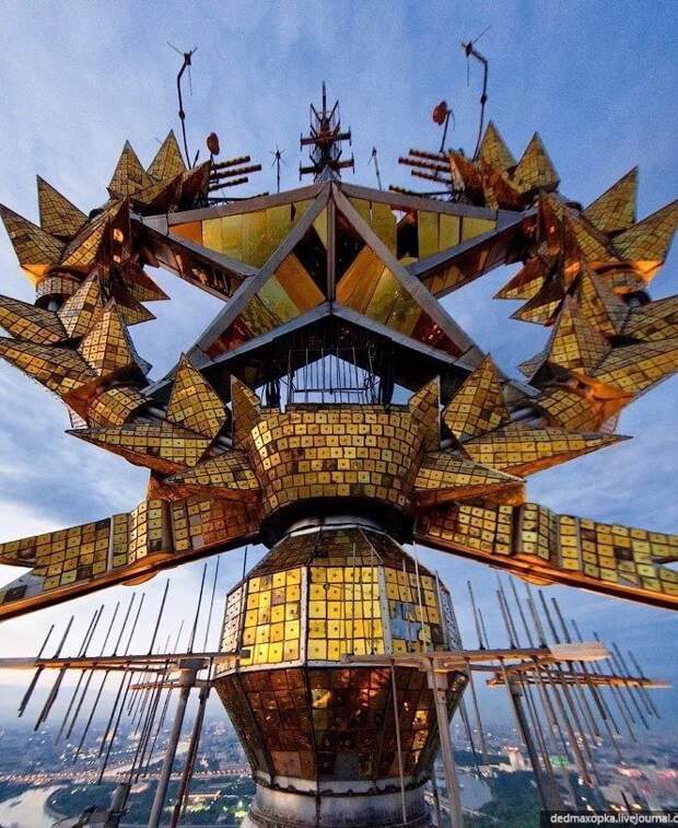 Монтаж шпиля реализовали при помощи самоподъемного крана УБК-15. Впрочем, подъемной мощи крана не хватало для перемещения некоторых конструкций весом 10-15 тонн. Инженеры решили проблему: конструкции поднимали через шахту, временно оставленную внутри здания, а под шахту были подведены железнодорожные пути.
