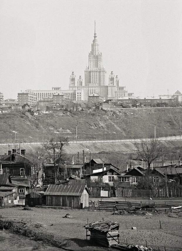 Деревянные дома вверху - остатки деревни Гладышево - она стояла почти на обрыве (на ее месте сейчас посольства Румынии, Болгарии и КНДР, за ними - Мосфильмовская улица).