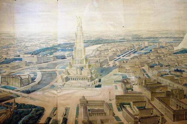 История любви советских архитекторов к небоскребам началась с Дворца Советов, по проекту самого высокого здания в мире. Его постройке помешала сначала Вторая мировая война, а потом проблемы с грунтом и изменения генплана. В итоге небоскреб высотой под полкилометра со статуей Ленина на вершине решили недостраивать.