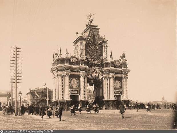 Вид празднично украшенных к торжествам коронации Красных ворот, 1896 год