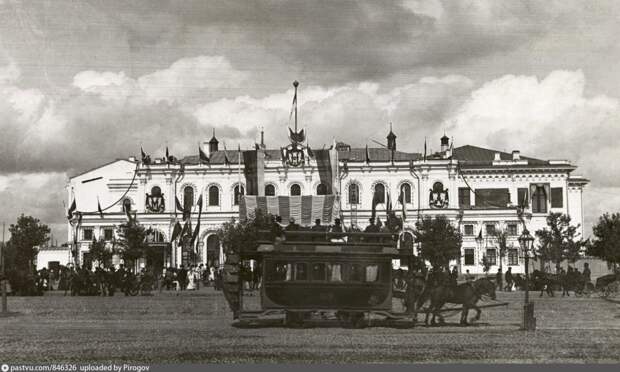Конка на фоне Ярославского вокзала, украшенного в честь одного из праздничных дней.