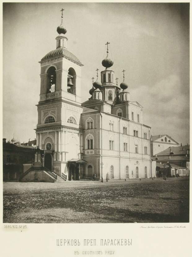 Церковь Параскевы Пятницы в Охотном Ряду. Фото из альбома Н.А. Найдёнова. «Москва Соборы, монастыри и церкви». 1881 г.Не сохранилась. Снесена в 1928 г.
