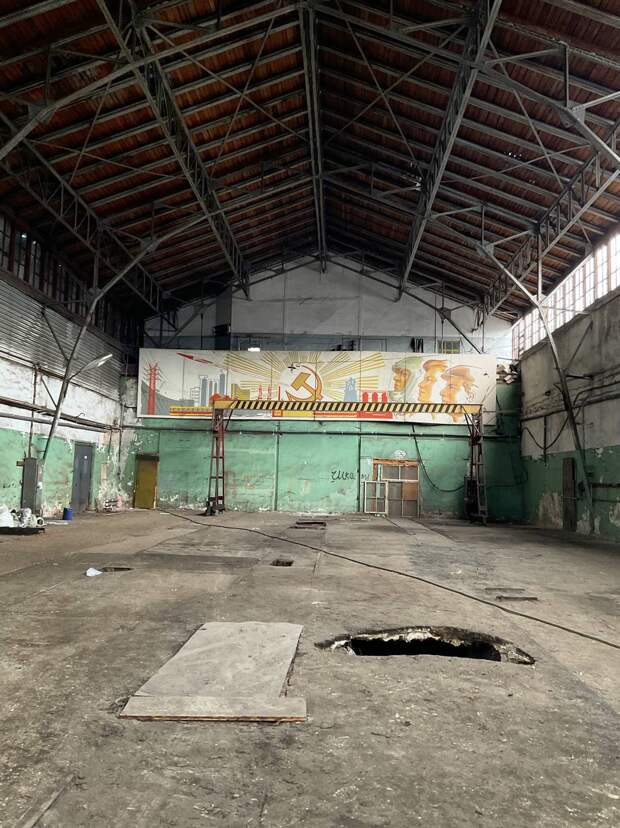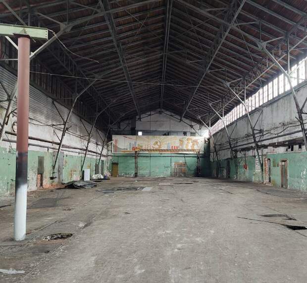 Внутри сохранились оригинальные металлоконструкции кровли и роскошные образцы советской агитации.
