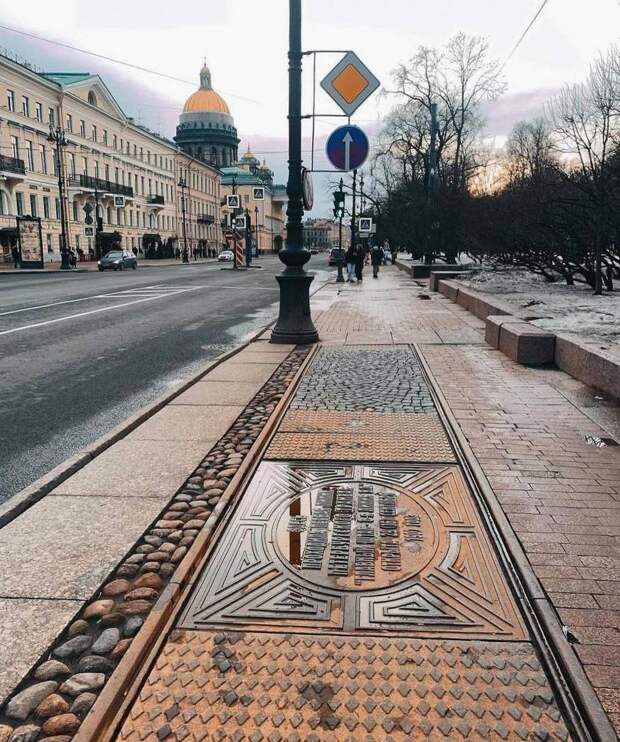 Памятная плита Первой линии трамвая в ПетербургеОна представляет собой рельсовый путь длиной 30 метров, вмонтированный в тротуар на Адмиралтейском проспекте.