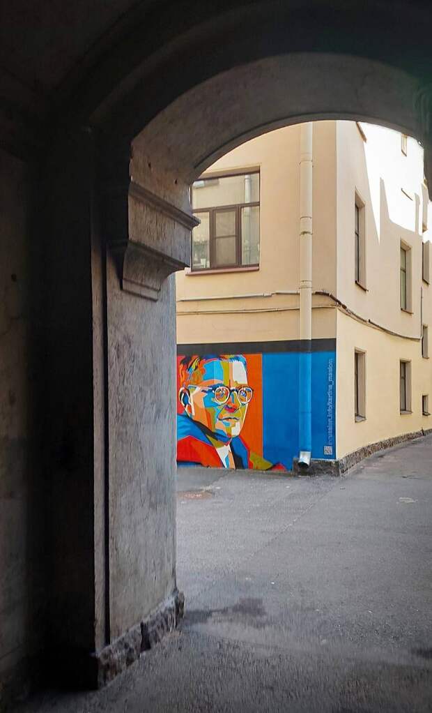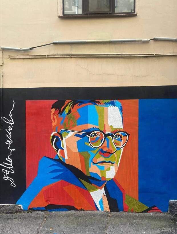 Дом трех Бенуа и ШостоковичНа Доме трёх Бенуа нарисовали граффити-портрет Дмитрия Шостаковича в октябре прошлого года.