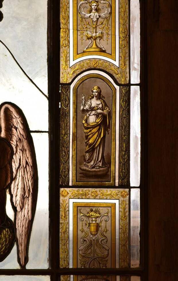 Данный витраж является одним из самых старых в Санкт-Петербурга. В некоторых источниках говорится, что он установлен в 1870-е гг., когда дом приспосабливался для Общества поощрения художников.