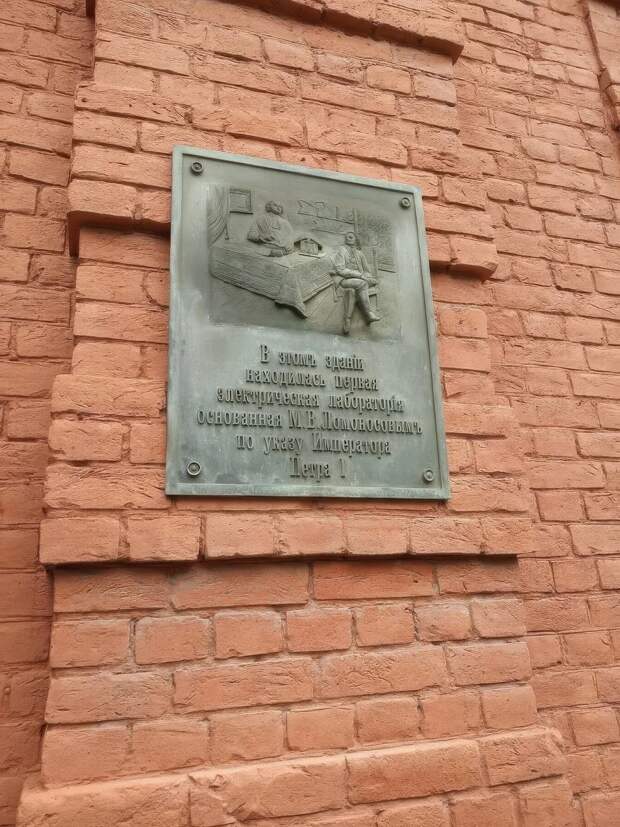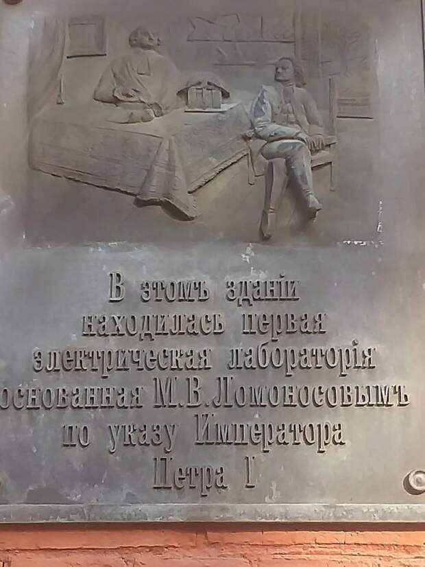На табличке изображен Петр I, Михаил Ломоносов. И подпись: «В этом здании находилась первая электрическая лаборатория, основанная М. В. Ломоносовым по указу императора Петра I».Здание, к слову, было построено в 1886 году, спустя более века после смерти Ломоносова, а сам он открыл химическую лабораторию. Даты жизни царя и ученого также не позволяли им встретиться во взрослом возрасте.