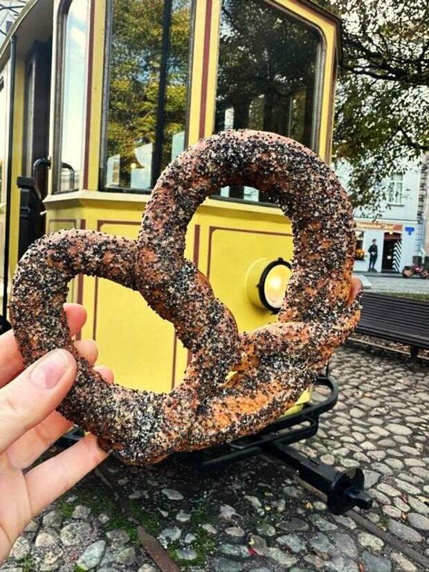 Внутри находится небольшое кафе, где можно попробовать вкусные крендели и выпить ароматный кофе!
