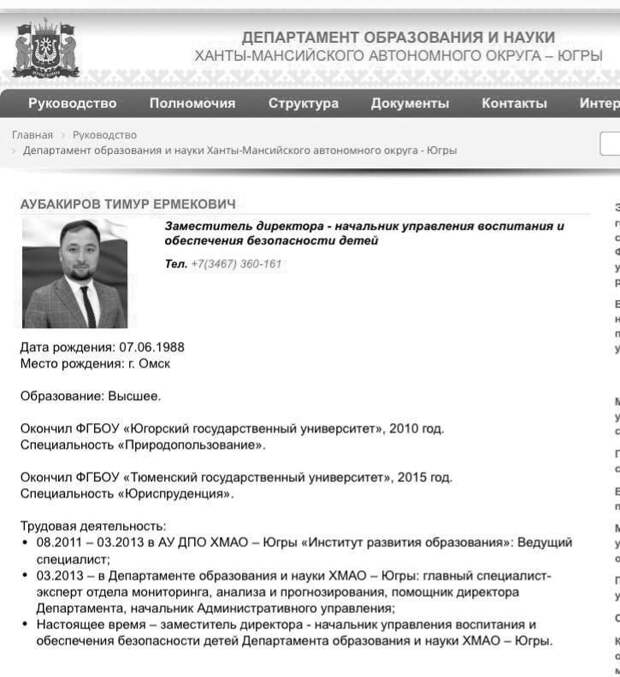 Тимур Ермекович Аубакиров — председатель комиссии по приёму детей в школы Ханты-Мансийска. Ещё в 2009 году на своей странице в соцсетях он едва справлялся с окончаниями и пунктуацией, щедро сдабривая записи матерными выражениями, а уже в 2010-м каким-то чудом сумел получить диплом.