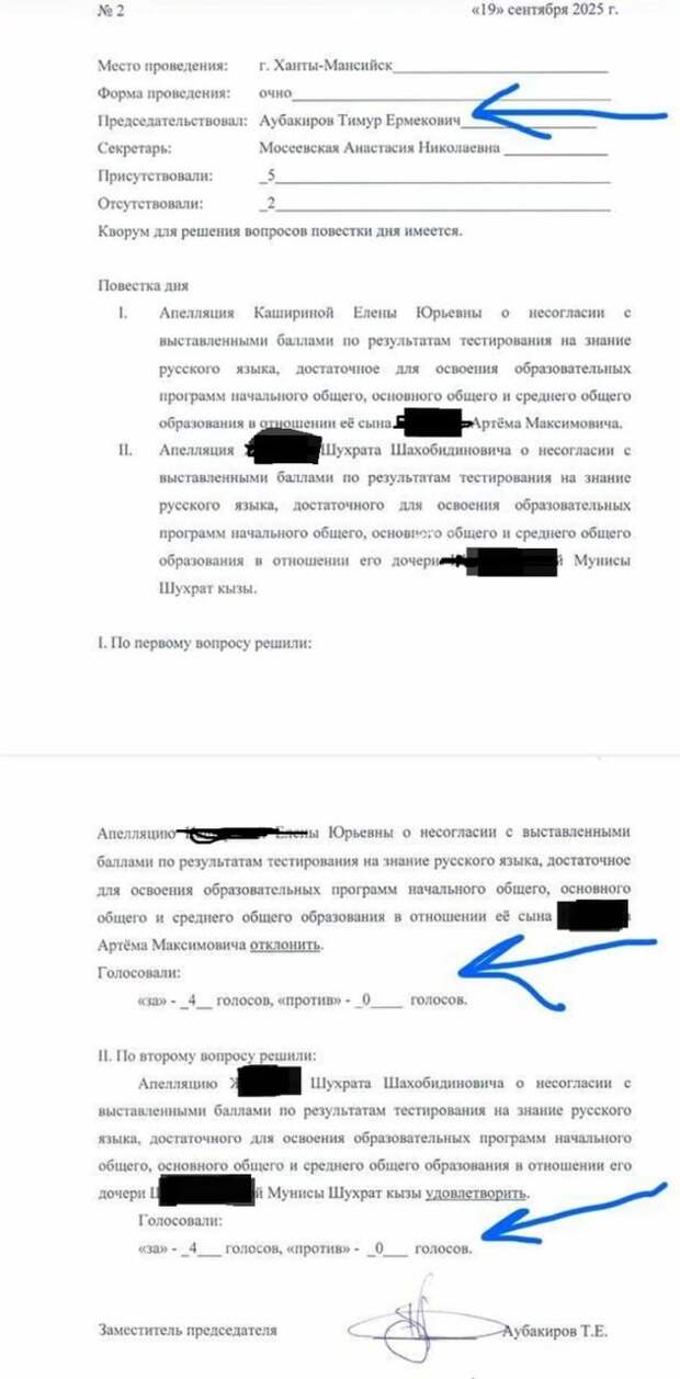 Возглавил комиссию уроженец Омска Тимур Аубакиров — заместитель директора и начальник управления воспитания и безопасности детей Югры.Комиссия рассматривала жалобы двух детей: Артёма, для которого русский — родной язык по информации СМИ, и Шухрата, для которого он — иностранный. Артёму отказали, а Шухрата приняли. Это всего лишь единичный случай, и, возможно, Шухрат много трудился и прекрасно выучил русский. Но почему не дали учиться Артёму, для которого наш язык родной?