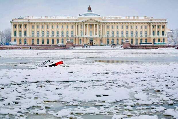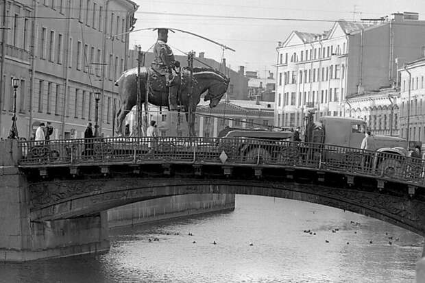 На снимке памятник Александру III буксируют к месту назначения через Большой Конюшенный мост на Мойке.