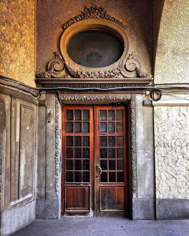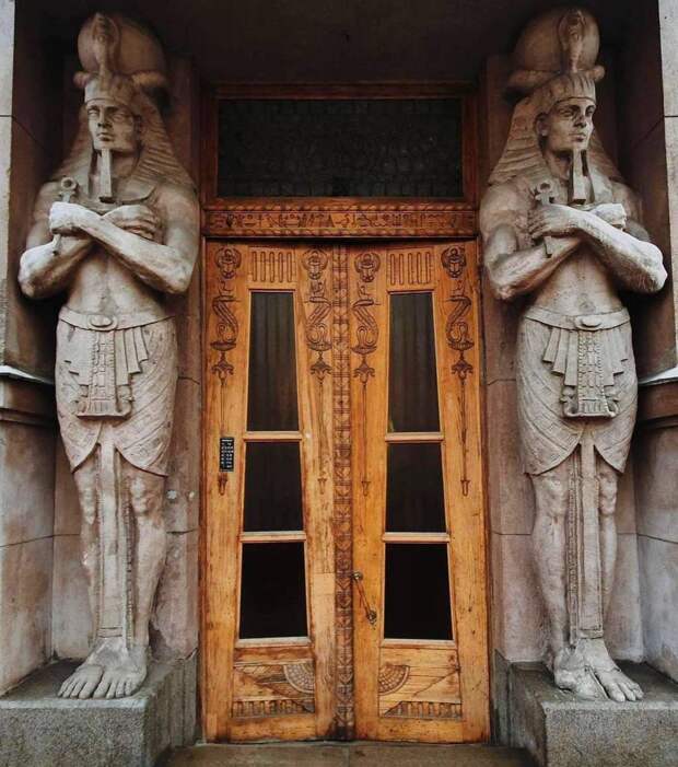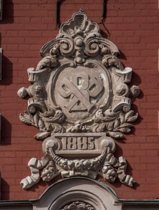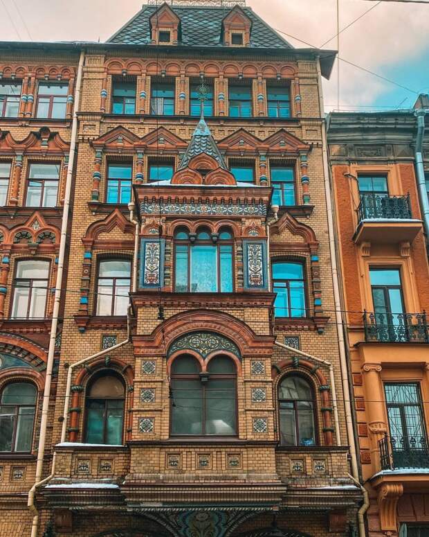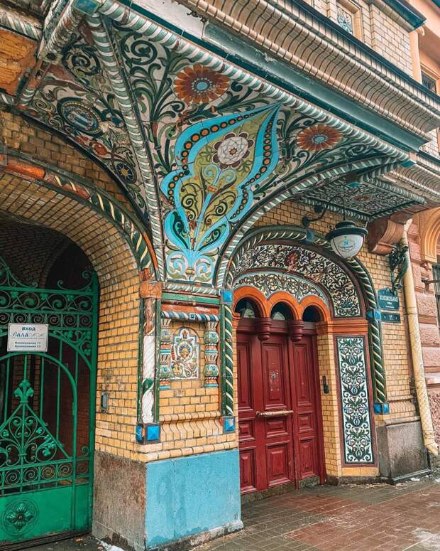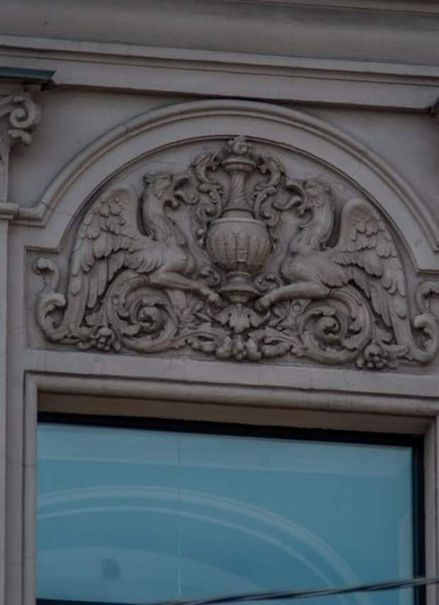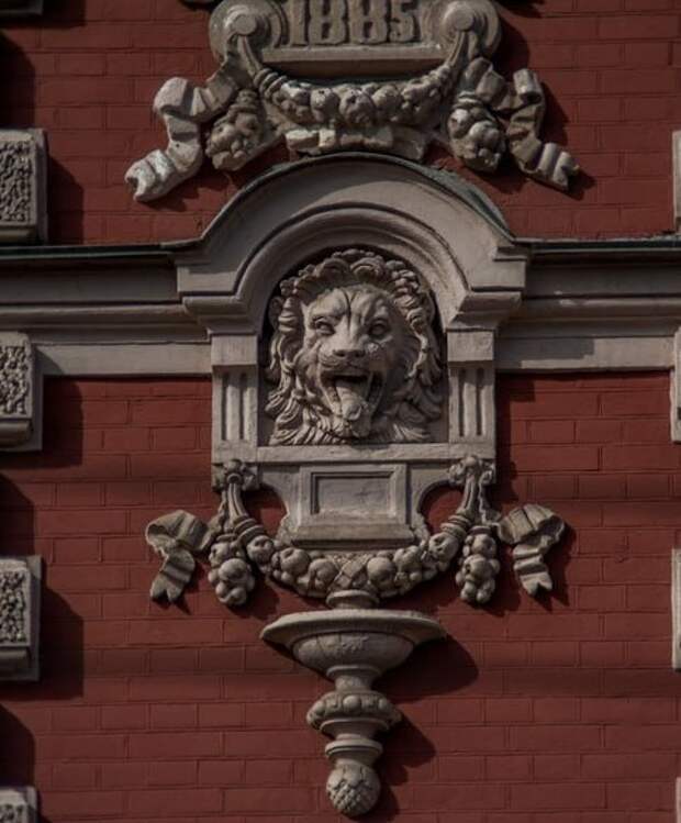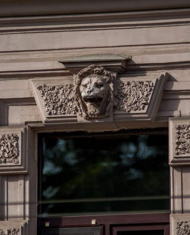 Этот шестиэтажный дом имеет протяжённый фасад и оформлен четырьмя эркерами, во двор ведёт огромная арка, высота которой равна четырём этажам! Интересно, что замковые камни арки украшены женскими масками, а вся лепнина выполнена в неподражаемом стиле эклектика.