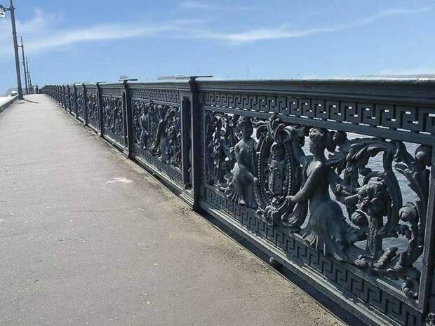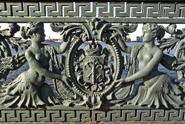 Литые чугунные решетки перил этого моста состоят из отдельных звеньев с повторяющимся рисунком: обращенные друг к другу русалки поддерживают овал с изображением герба города.