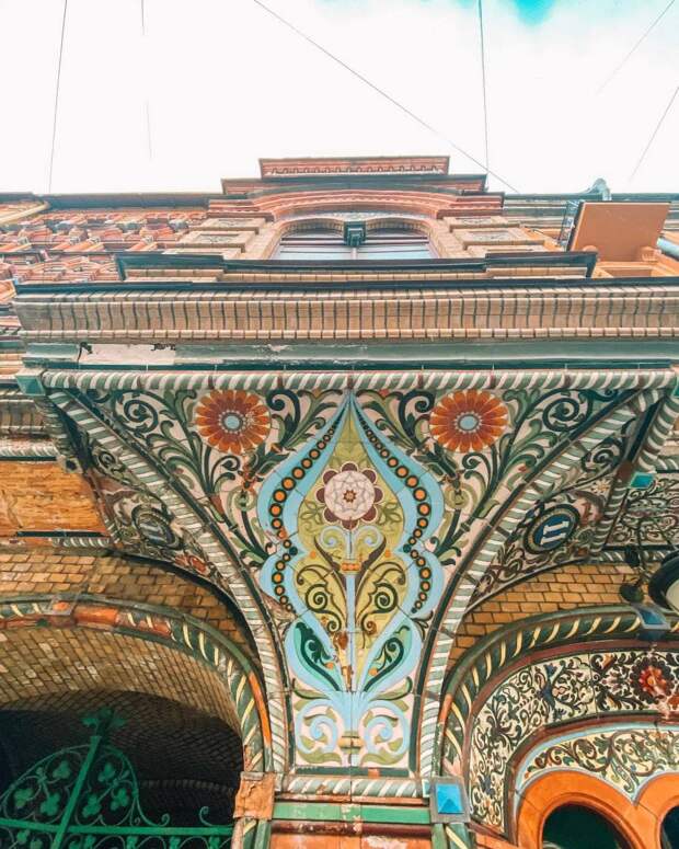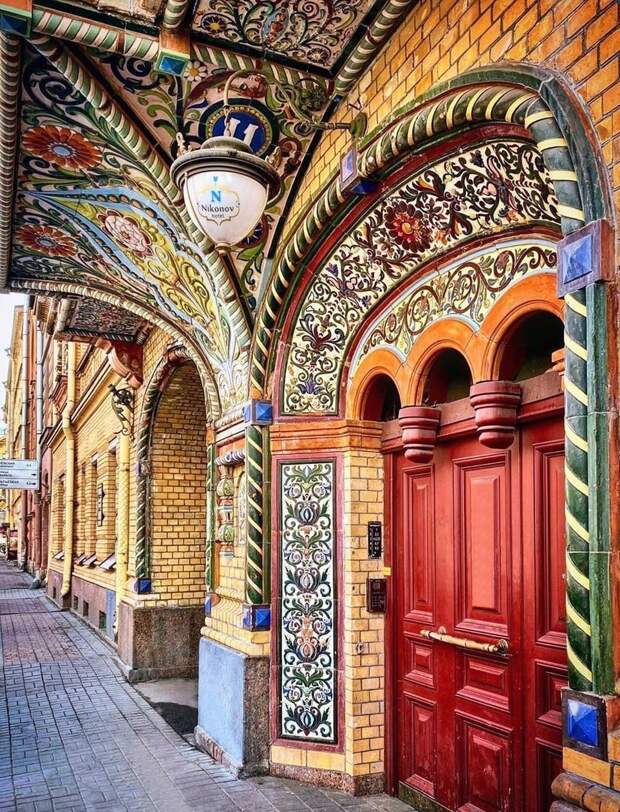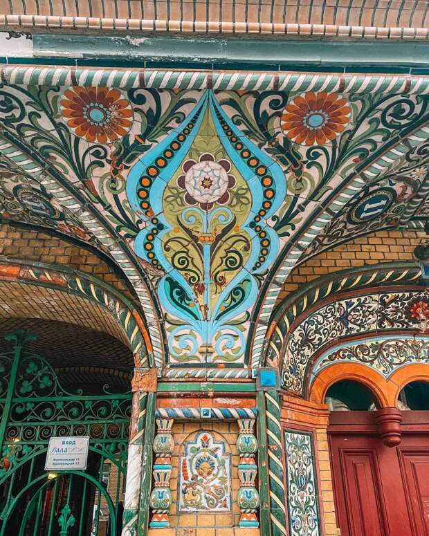 Кладка из цветного кирпича, богатство изразцов, шатровые кровли и мозаика — приметы неорусского стиля, столь популярного в начале ХХ века.