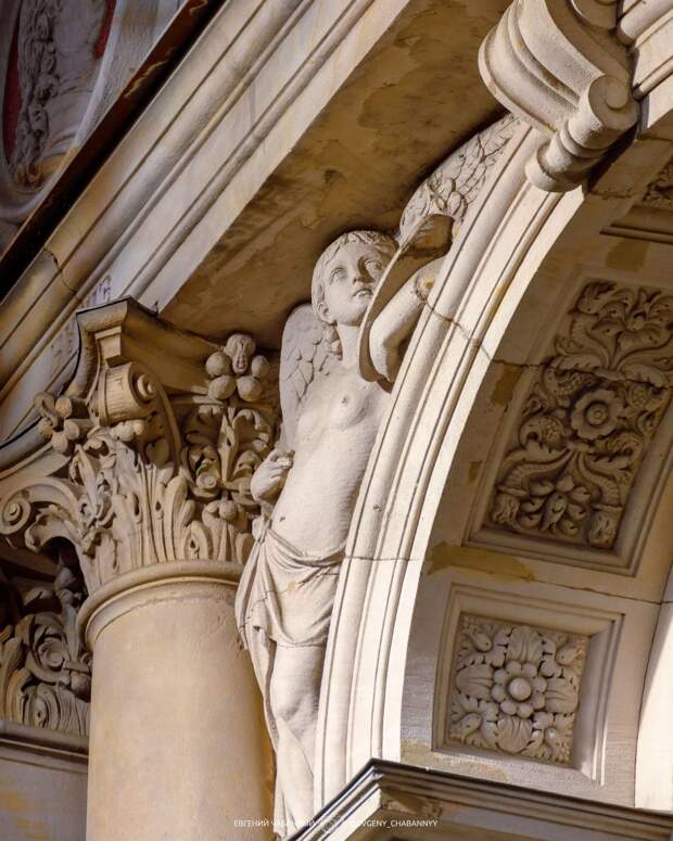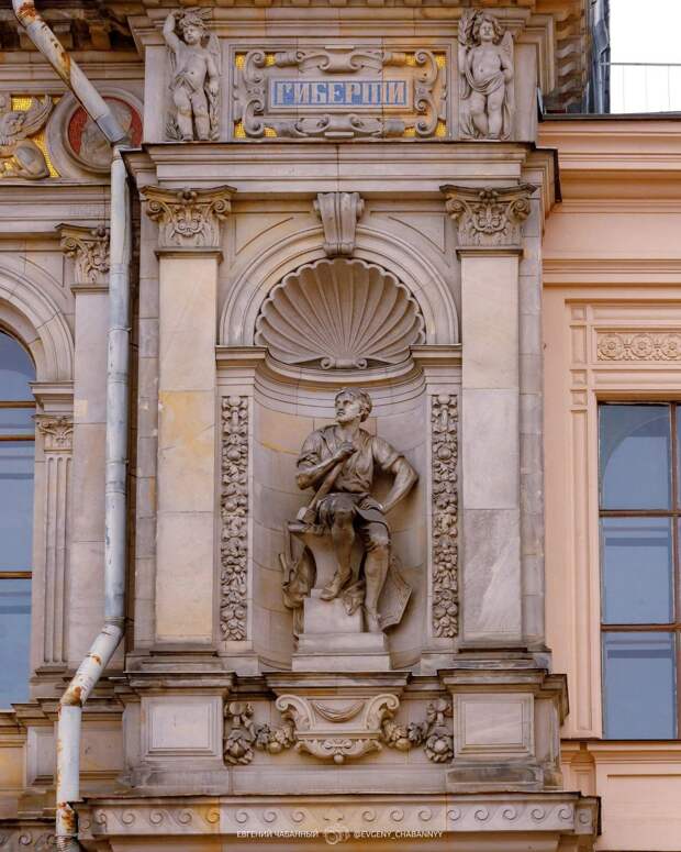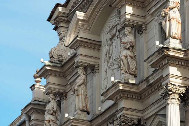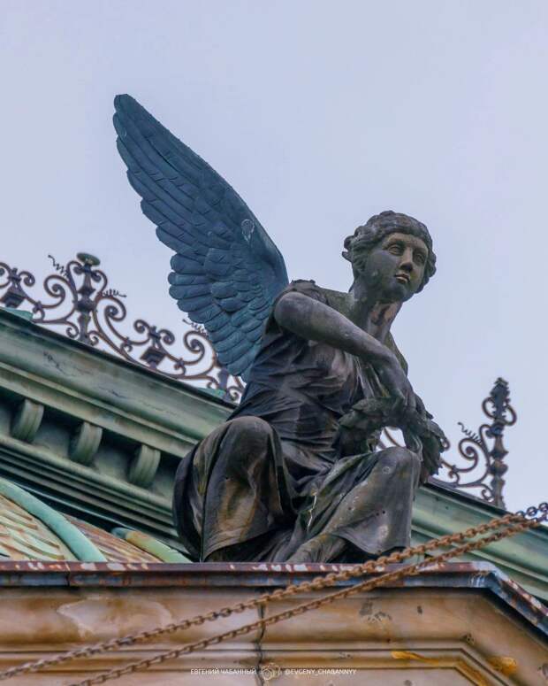Скульптура, которую городской фольклор прозвал «Ангел пустые руки» с купола церкви Св. Екатерины на Васильевском острове.