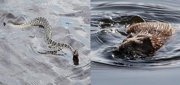 Что случилось, можно было только догадываться. Я думаю, что змея переплывала арык (я это часто наблюдал), а ондатра (водяная крыса) плыла по течению, и вот тут, должно быть, их дорожки пересеклись! А может это пираньи напали на змею?!