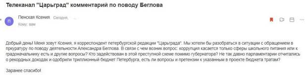 «Мы бы не хотели разглашать, как я и говорил, содержание письма до момента получения его Бегловым и Генеральным прокурором, для того, чтобы не навредить расследованию. Коррупция касается большинства сфер жизнедеятельности города, в заявлении они все перечислены. В преступных схемах помимо губернатора задействовано большое количество лиц. Структуру бюджета в данном заявлении мы специально не анализировали. Объем заявления около 30 печатных листов». https://t.me/Prigozhin_hat/1929