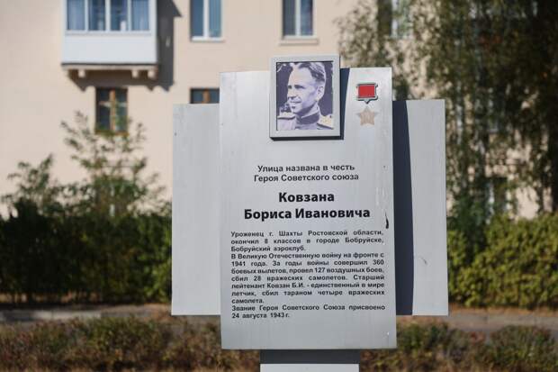 В Минске и в Рязани на фасадах домов, в которых жил легендарный летчик, Герой Советского Союза Борис Иванович Ковзан установлены мемориальные доски.