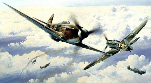 « Бой был своеобразный: атакуешь бомбардировщик, смотришь, на тебя заходит истребитель. Один «Мессер» заходит в хвост моей машины. Я, чтобы выйти из — под удара, резко снизился, потом взял ручку на себя, перевёл машину на спину и убрал резко газ. Истребитель, который атаковал меня сзади, проскакивает под моей машиной. Я из такого перевернутого положения заметил, что другой «Мессер» переходит в лобовую атаку. С дистанции 1200 метров открываю огонь. Самолёт противника летел — летел, потом клюнул, пошёл вниз. Смотрю, выбрасывается парашютист…»