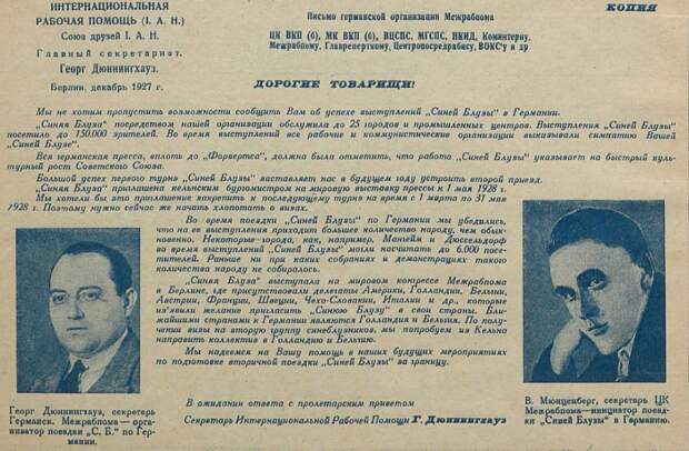 Письмо германской организации Межрабкома о поездке «Синей блузы» в Германию