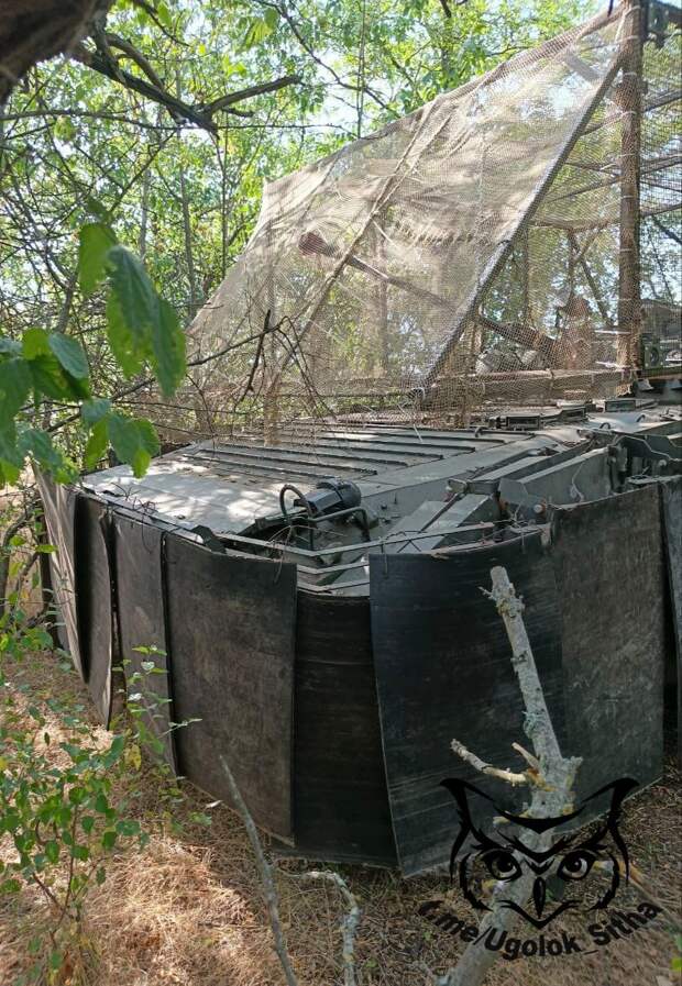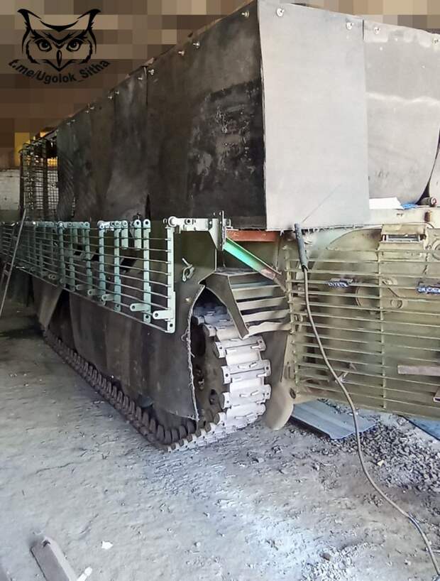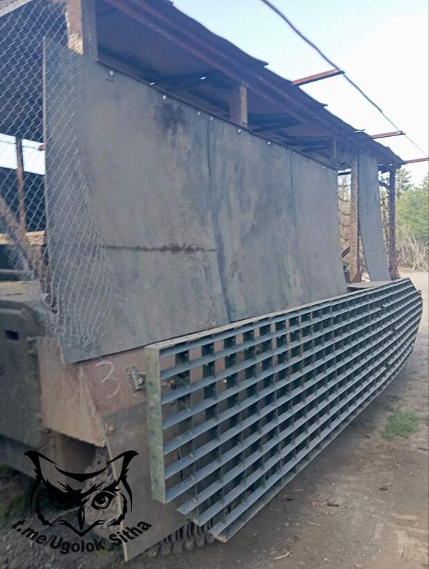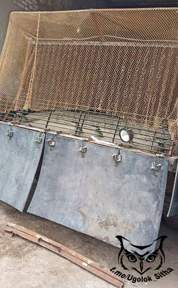Боевая машина оснащена самодельным защитным "панцирем" из сетчатых экранов и металлических цепей. Конструкция позволяет свободно поворачивать башню танка. Сверху она накрыта маскировочной сетью. Гусеничное шасси дополнительно защищают резиновые экраны и блоки динамической защиты.