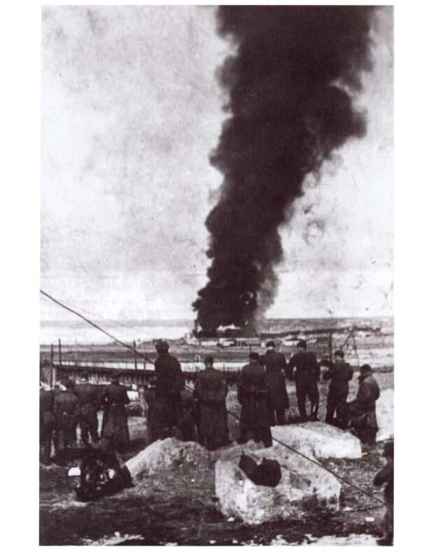 Как позже удалось выяснить, изображенные на фото события произошли почти сразу после диверсии, осуществленной старшим лейтенантом госбезопасности Александром Сидорчуком (позывной — Моряк) и его супругой Галиной. Им удалось поджечь Ингульский военный аэродром, и пожар бушевал с такой силой, что потушить его не удавалось многие часы. В результате было уничтожено 27 вражеских самолетов, а также значительное количество запчастей и горючего. Эта операция вошла в историю как одна из крупнейших диверсий против фашистских захватчиков.