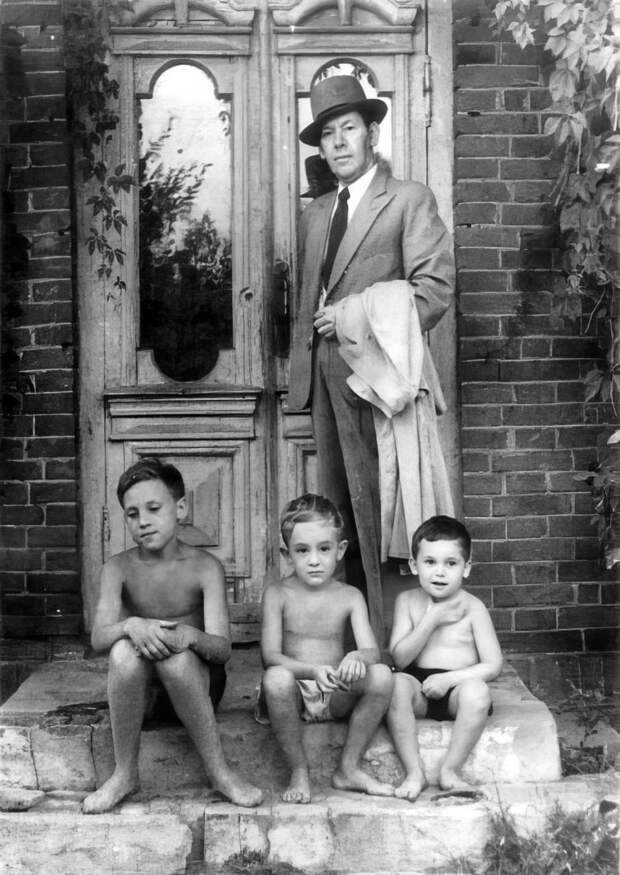 Попалась редкая фотография Володи Высоцкого. Он узнаваем даже в раннем возрасте. Вольф Шлемович Высоцкий с внуками. Крайний слева - Володя. 1951 год.