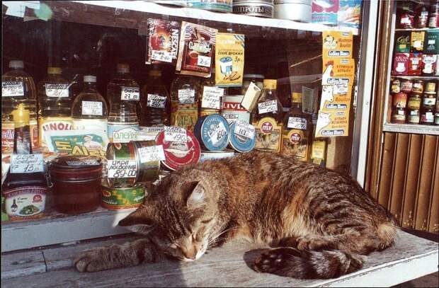 Интересная фотография из 2000 года. На ней запечатлён уставший пушистый охранник икры на прилавке Василеостровского рынка.