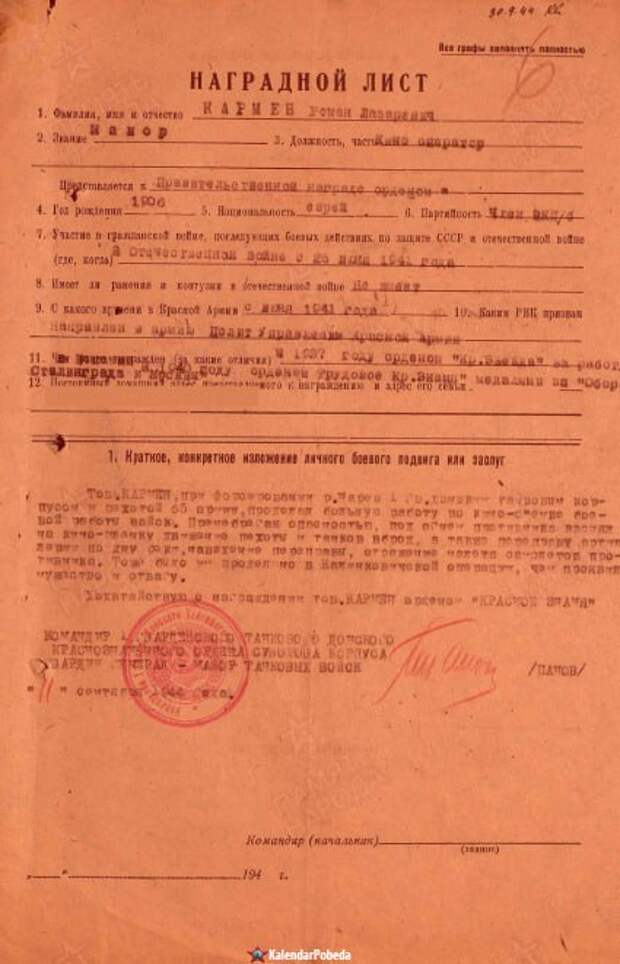 В записях из архивного фонда ЦАМО изложена краткая информация о награждении Заки Багаутдинова в 1945 году высокой наградой - орденом Красной Звезды: