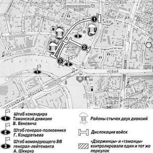 Командиру Таманской дивизии генерал-майору Евневичу В.Г. была поставлена задача занять позиции на Краснопресненской набережной, включая переулок Глубокий от Рочдельской улицы до набережной. При этом по приказу министра обороны генерала армии Грачева П.С. на бэтээрах дивизии были размещены вооруженные автоматами добровольцы - ветераны афганской войны.